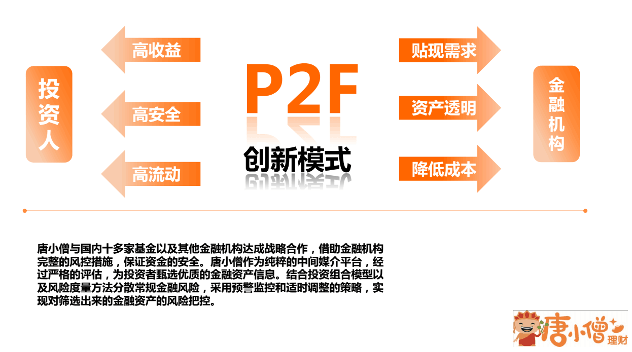 查看该公司全部产品>>2015年微信理财龙虎榜,投资理财新项目, 本息担保稳稳增值【唐小僧理财】产品齐全、风格多样,能够满足各类风险偏好投资者的需求,是由【唐小僧理财】公司专业提供的,业务办理便捷,您只需满足年满18岁以上的人群,资金投入100元起便可轻松办理本公司的理财项目。 唐小僧秉持“以客户为中心”的核心服务理念,拥有一支专业的资金管理队伍,帮助客户实现资产保值、增值的目标。我公司的【唐小僧理财】主要收益方式是固定年化收益率8%以上,凭借良好的专业能力和业绩表现,得到了社会各界的广泛认可。理财形式: 小额投资:100元赎回时间:随存随取,实时到帐 到账时间:实时到账 办理流程:微信关注唐小僧,点我要取金,再按指引办理 风险说明:本息保障,低风险高收益,获 知名机构安全认证(CSASTAR、ISO/IEC27001) 投资形式:互联网理财 风险等级:R2(稳健型) 币种:人民币 投资方向:P2F投资理财 类型:开放式基金 价格:100元(人民币) 理财项目:【唐小僧理财】 具备条件:年满18岁以上的人群,资金投入100元起 提供单位:【唐小僧理财】公司 收益介绍:固定年化收益率8%以上 低风险的【唐小僧理财】,【唐小僧理财】力荐,【唐小僧理财】信息 参数仅供参考使用,实际为准。资邦元达(上海)互联网金融信息服务有限公司是上海市影响力大的资金合作企业,是 投资者获取资讯、互动交流的佳选,资邦元达有着广泛的品牌影响力,拥有 、及时的基金资讯和数据,为广大投资者提供 【唐小僧理财】服务! 更深入的高收效理财力荐,【唐小僧理财】公司,无风险个人理财公司。【唐小僧理财】优势: 随存随取,本息无忧,固定年化收益率8%以上 【唐小僧理财】是一个为投资者提供移动互联网投资理财服务的平台,其突出特点是以类似活期存款随时存取的方式享受8% 理财收益。【唐小僧理财】始终将客户资金安全放在 ,其理财产品背后对接的资产是经过智能风控组合的一揽子债权权益,收益稳定,风险超低趋近于零。 高收益: 8% ! 活期理财产品 【唐小僧理财】收益率为固定年化8% ,更有持续不断的送现金活动等你参加。(注意不是预期收益,而是承诺保证收益不低于8%)【唐小僧理财】收益 =活期存款*23 倍 >一年期定期存款*3.2 倍 >宝宝类理财产品 X 2 倍 七大保障:频念投资紧箍咒 1.本息保障计划: 【唐小僧理财】所投项目均来自有'充分还款保证'的借贷项目。 2.第三方资金托管保障: 平台资金全程由新浪支付托管,实时专款专用,与平台自有资金完全分离。所以,您再也不用担心我们会跑路喽! 3.风险准备金计提: 每笔债权成交时,将提取 比例的金额放入银行'风险准备金'账户,如果投资人出借资金出现逾期,风险准备金将启动,对投资人进行全额本息垫付。 4.第三方担保保障: 由注册资本金2亿元的第三方担保公司中德担保提供全额本息保障。 5.债权组合分散风险: 采用'智能分散投资'思路,选取通过严格风控审核的上万份债权,经过后台模型的智能计算,生成债权包组合,通过分散投资来规避部分坏账风险。 6.严格的风控体系: 依托资邦在资本金融界的强大实力,【唐小僧理财】采用国内外 的科学信用审核与风险控制体系,推出了 的信用审核及风控体系。 7.平台安全获 认证: 【唐小僧理财】平台已通过 知名机构安全认证(CSA STAR、ISO/IEC 27001)、信息安全等级保护,您可以完全放心。 六大优势:提现快似筋斗云, 收益稳如定海针 高流动性: 随存随取,实时到账。 1.高额收益: 收益8% ,另外每天签到还有额外收益拿,更有持续不断的送现金活动等你参加。 2.操作便捷: 手机上即可完成理财产品购买,不受时间和地域限制,是您手中的移动银行。 3.安全无忧: 7大安全保障,本息无忧。 4.当日计息: 投资当日即可产生收益,可用于超短期理财,大大增加资金利用效率。 用户充值和提现目前皆免收手续费。 5.平台规则 起投金额: 100 元。 计息: 年化收益率 8% ,买入 当 天开始计息并产生收 益 (第二天可看到前一天的收益情况) 6.赎回限额: 单笔≤5 万元 每日限额≤ 10 万元 提现到银行卡: 每次≤ 5 万元 每日累计≤ 10 万元 账户充值: 1 元≤单笔充值金额≤ 5 万元 平台背景:【唐小僧理财】是资邦旗下移动互联网理财品牌,团队由一群专业的金融人士、 的互联网从业者与更懂用户的精英组成,致力于打造'拥有用户体验的活期高收益理财平台'。